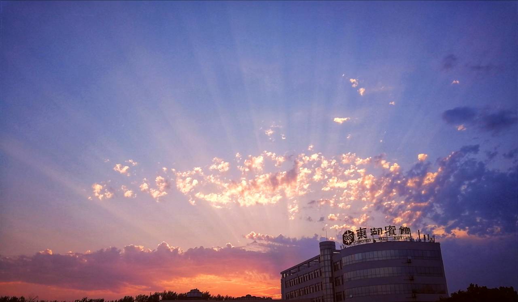 清晨,万籁俱寂,东边的地平线泛起的一丝丝亮光,浸润着浅蓝色的天幕,新的一天从远方渐渐地移了过来。墨蓝的沉重的天幕正一点点地向背后徐徐撤去,那美丽的蔚蓝色晨曦刚刚在遥远的东方染着校园。傍晚,太阳从天边渐渐坠下,渲染了整个天空。或是紫色微染,或是红如烈火,或是橙如枫叶,美丽且壮观。