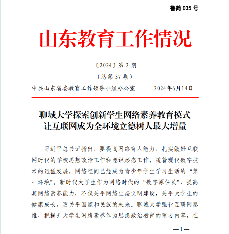近日,中共山东省委教育工作领导小组办公室《山东教育工作情况》简报2024年第2期,以《聊城大学探索创新学生网络素养教育模式 让互联网成为全环境立德树人最大增量》为题,刊发我校创新构建“1234”大学生网络素养教育模式,引导青年学生依法用网、文明健康上网的经验做法。这是2022年以来中共山东省委教育工作领导小组办公室工作简报与山东省教育厅(中共山东省委教育工委)工作简报,第四次面向全省各地市、高校推介我校宣传思想文化工作经验做法。