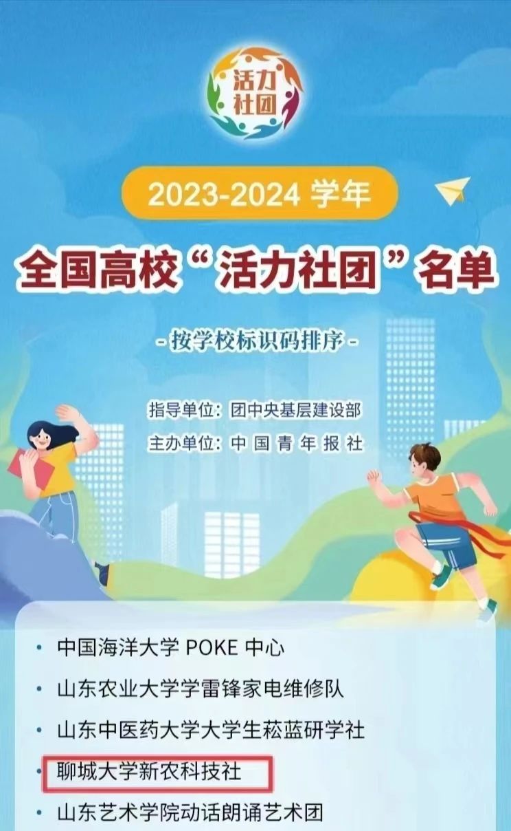 近日,由团中央基层建设部指导中国青年报社开展的全国高校“活力社团”风采展示活动落下帷幕,聊城大学新农科技社成功入选“2023-2024学年全国高校‘活力社团’”TOP100,再一次生动诠释了“农业强国”建设中聊大青年学子、学生社团的挺膺担当和青春风采。