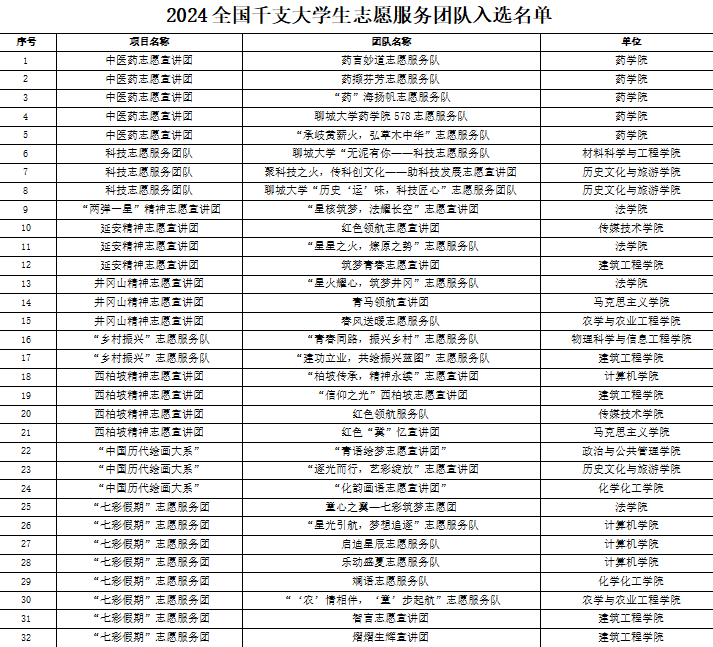 近日,团中央青年志愿者行动指导中心发布中医药志愿宣讲团、科技志愿服务团队、“乡村振兴”志愿服务队、“中国历代绘画大系”等九项全国千支大学生志愿服务团队入选名单,聊城大学32支团队入选。