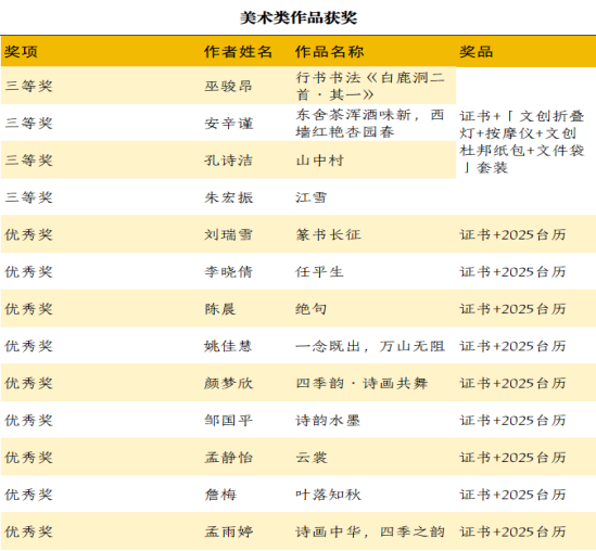 我校师生提交的作品题材丰富、形式多样,既有《行书书法〈白鹿洞二首·其一〉》《山中村》等展现传统书画技艺的美术佳作,也有《大美天地》《诗意盈校苑》等融合诗词意境与现代视听表达的视频创作,充分体现了我校师生对中华诗词文化的深刻理解与创新传承。