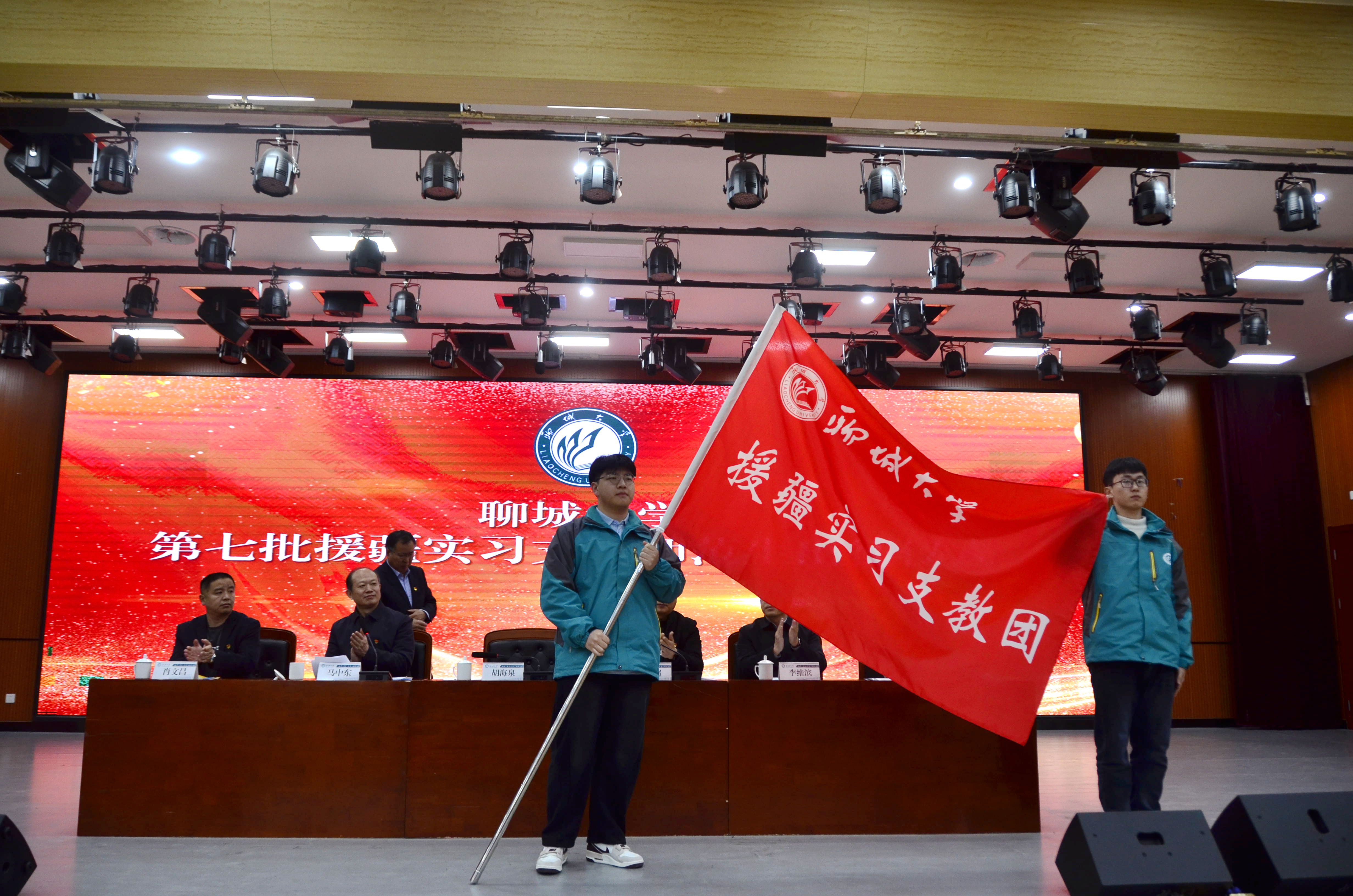 仪式上,校党委副书记胡海泉为第七批援疆实习支教团指导教师颁发聘书,并为支教团授旗。支教团领队教师王芳、学生代表彭秀清分别作表态发言。她们表示,将牢记学校嘱托,传承前六批支教团的优良作风,以高度的责任感和使命感投身支教工作,将“崇教、尚学、敦厚、奋进”的聊大精神融入边疆教育事业,为促进东西部教育均衡发展贡献力量。