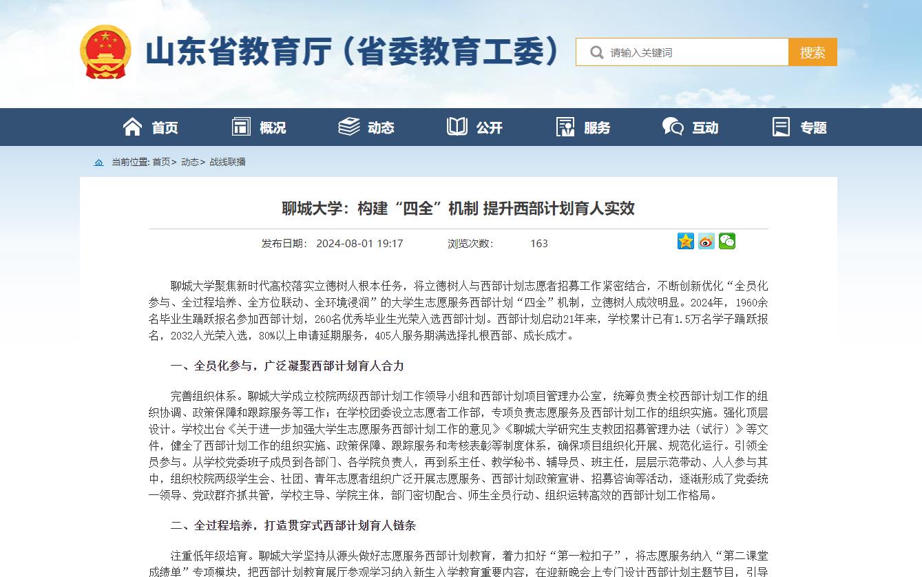 【山东省教育厅(省教育工委)】发布聊城大学:构建“四全”机制 提升西部计划育人实效