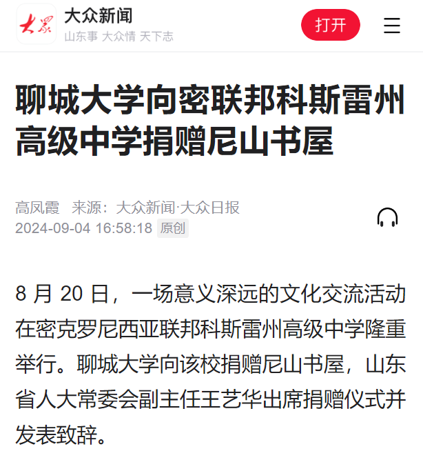 【大众日报客户端】报道聊城大学向密联邦科斯雷州高级中学捐赠尼山书屋