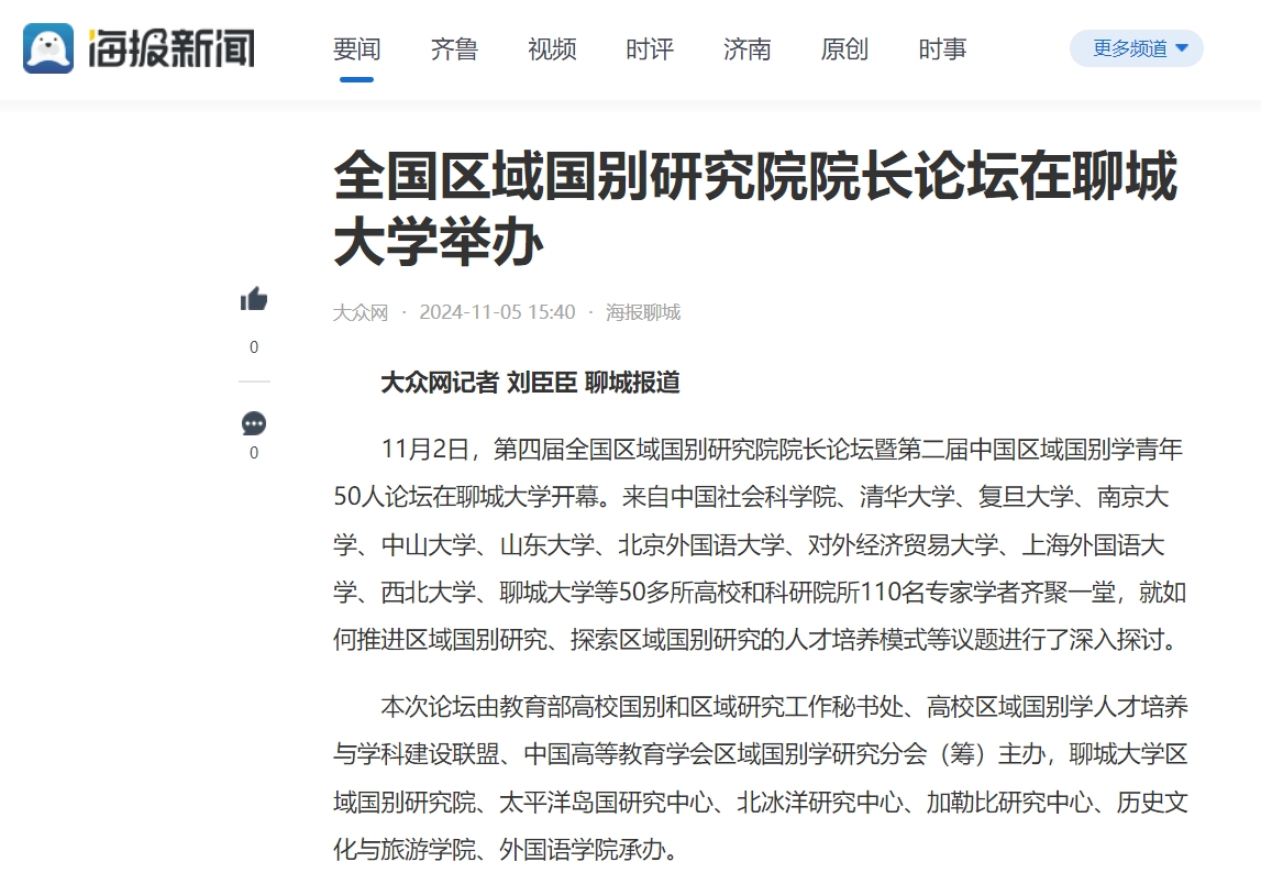 【编者按】11月4日、5日,凤凰网和大众网• 海报新闻分别报道了全国区域国别研究院院长论坛在聊城大学举办的消息。