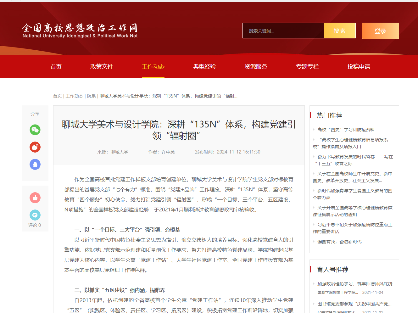 【编者按】11月12日,全国高校思想政治工作网以《聊城大学美术与设计学院深耕“135N”体系,构建党建引领“辐射圈”》为题报道了我校美术与设计学院“一个目标、三个平台、五区建设、N项措施”的全国样板党支部建设的经验。